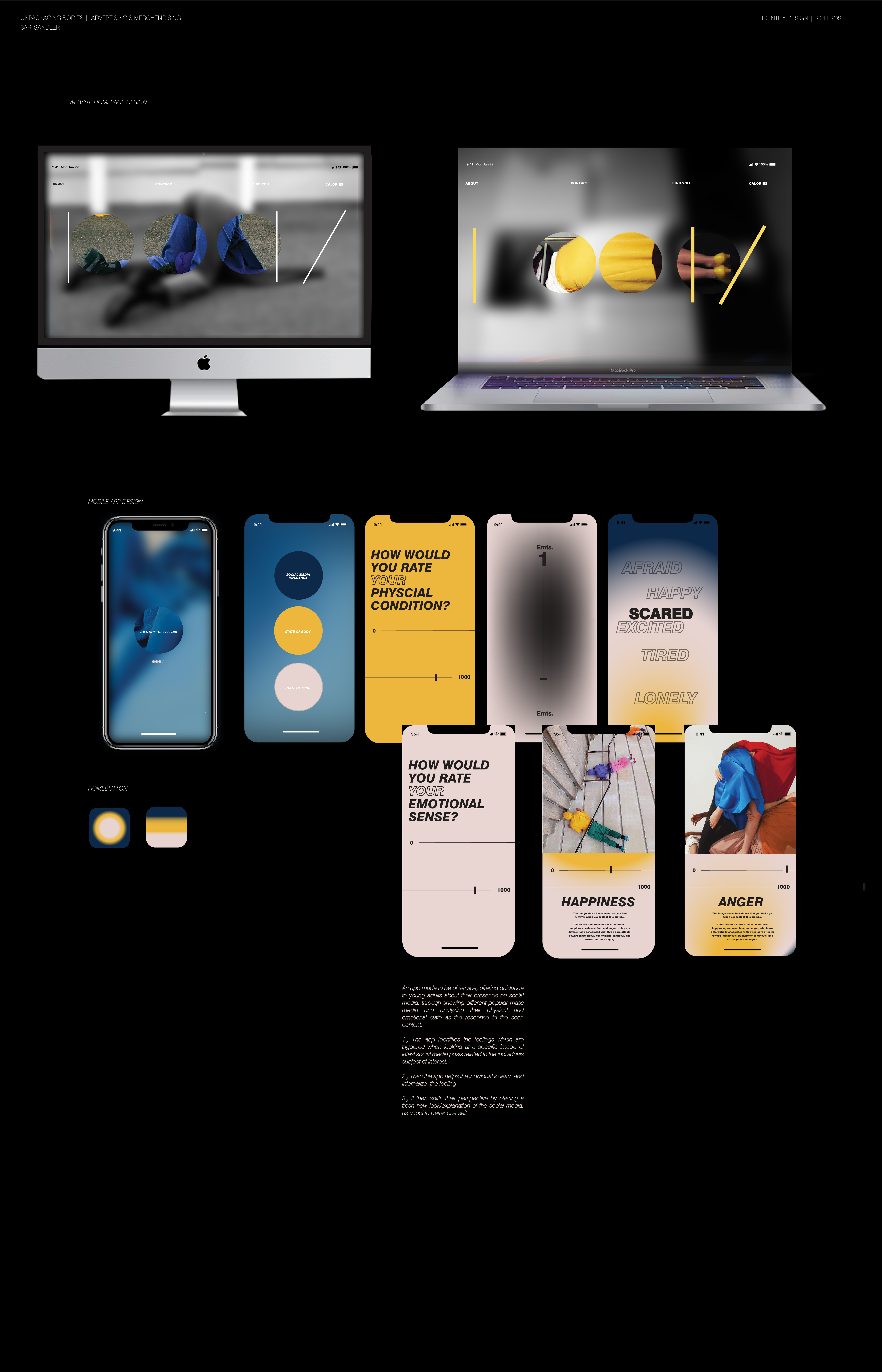 An identity for a Body campaign that focuses on how social media alters the way young adults see themselves. A 'Body Podcast" is created as a service that offers guidance to young adults and monitors their presence on social media. A 'Body' mobile/computer app also showcases different popular mass media in order to analyze the state of the individual viewing the content. Afterwards, it determines both the physical and emotional state as the response to the seen content.